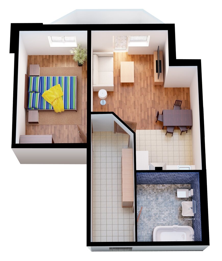 Есть отличительные зоны для кухни, гостиной, спальни и ванной комнаты.Более просторные апартаменты с одной спальней могут также иметь отдельную обеденную зону, выделенное место для хранения вещей и / или небольшую частную террасу или двор. С другой стороны, однокомнатная квартира — это просто одна большая комната с кухонной стойкой и техникой с одной стороны и ванной комнатой с дверью (в соответствии с требованиями жилищного законодательства США). Вы можете заполнить эту большую комнату без стен обычными предметами, такими как обеденный стол и стулья, диван, кровать, комод и все, что вам удобно. Добавление перегородок может помочь создать несколько отдельных жилых зон, но также может сделать атмосферу напряженной и тесной.Альтернатива — жить в одной большой многофункциональной комнате, где вы едите, спите и развлекаете себя и гостей.