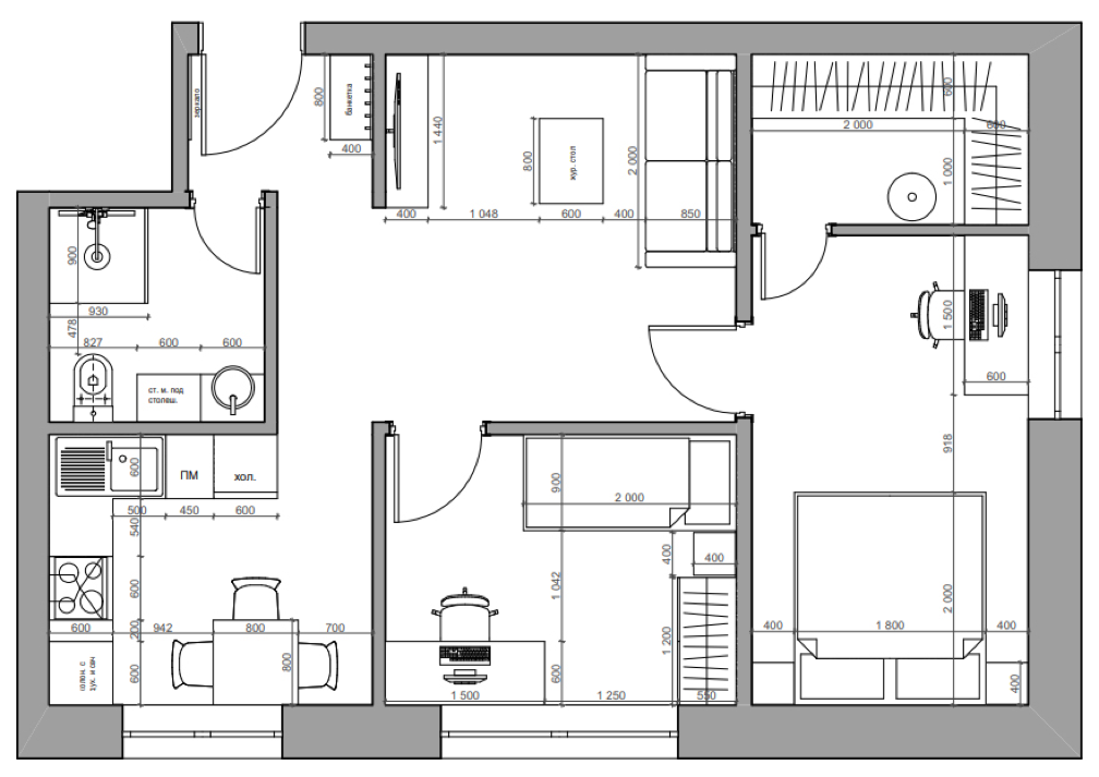 В этом случае ввиду расположения квартиры на последнем этаже удалось расширить достаточно тесную кухню за счет санузла, а также увеличить площадь жилой комнаты, демонтировав встроенные шкафы.