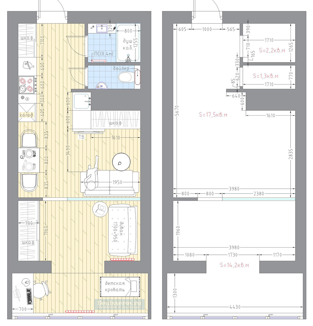 Нестандартное, при этом очень интересное решение планировки небольшой квартиры-студии предлагает использование двигающегося по рельсам гарнитура. В дневное время кровать прячется в нишу. На диване можно расположить третьего члена семьи. При этом в комнате остаётся достаточно места для подвижных игр.
