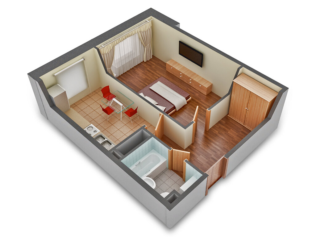 Это квартира, в которой изолирован только санузел: коридор переходит в единственную комнату с не отделенной перегородкой кухней. Студии стали все чаще появляться в современных постройках, как вариант бюджетного жилья. Они имеют увеличенную по сравнению с гостинками и малосемейками площадь и место для полноценного кухонного гарнитура. Однако не стоит путать студии с однокомнатными квартирами, в которых была снесена перегородка между комнатой и кухней: внешне они похоже, но студии обычно меньше площадью и запланированы такими самим застройщиком.