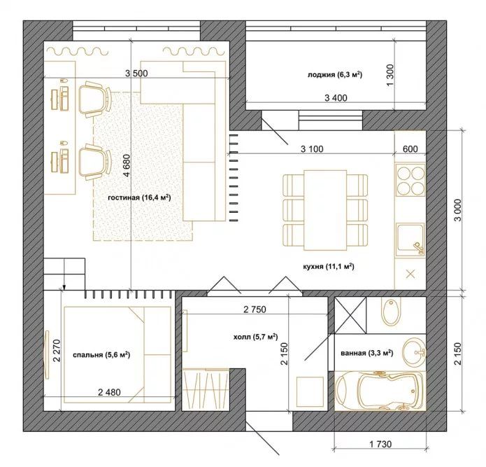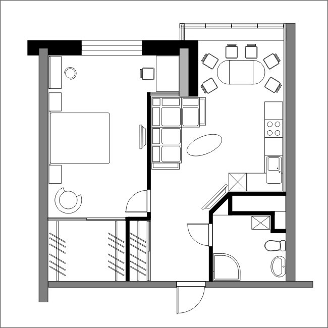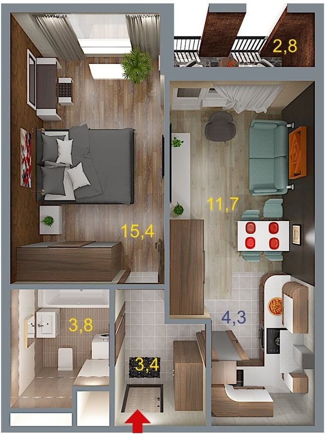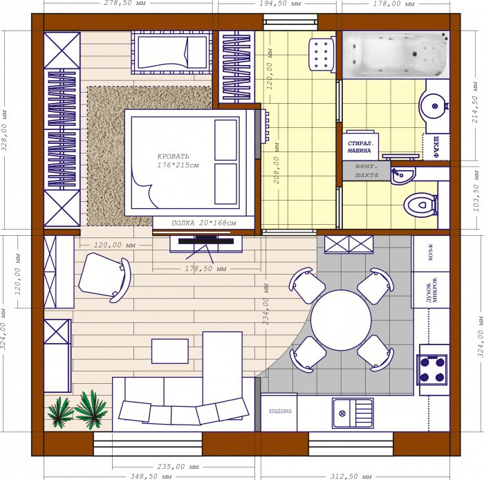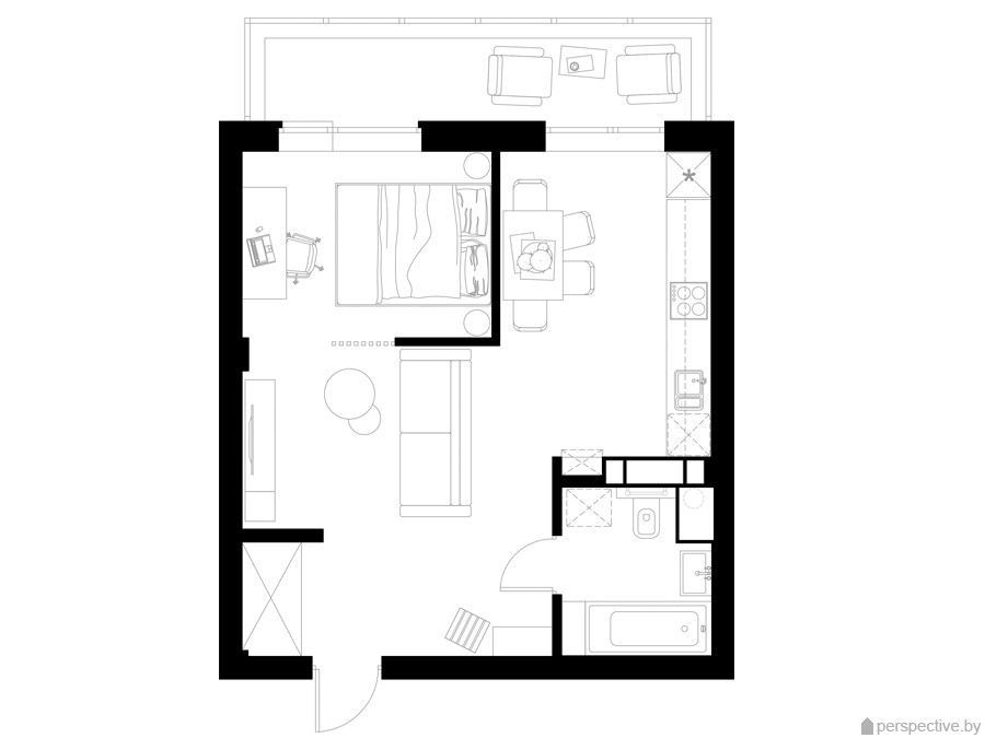Главное — это грамотно распланировать всю площадь, чтобы выделить место и для отдыха, и для сна, и для хранения вещей, и для санузла. Сложности может добавить не только неправильная форма и тесные комнатушки, но и расположение коммуникаций, которые очень часто переносить нельзя.