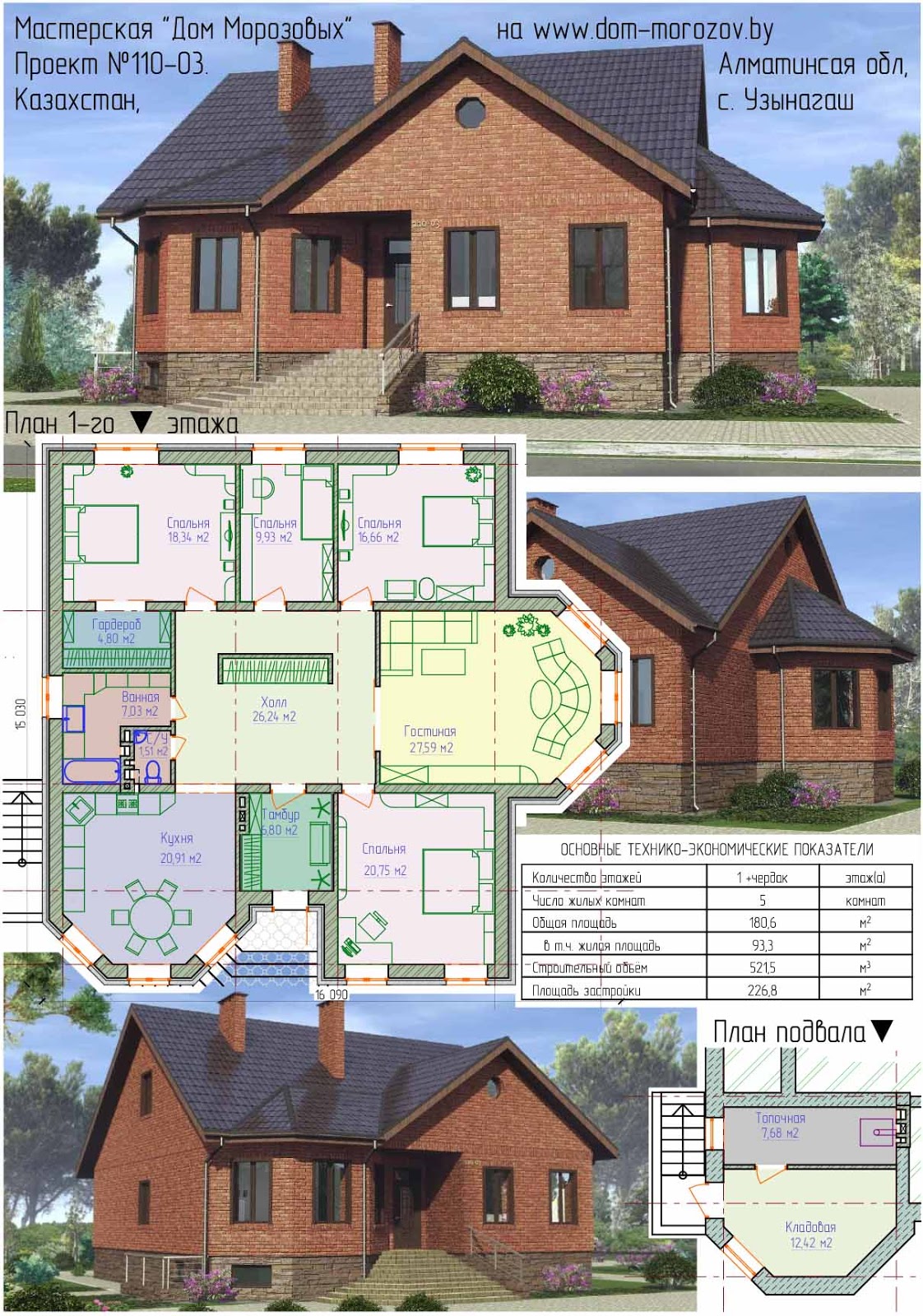 Проект первый предполагает наличие достаточно большой и просторной кухни, расположенной недалеко от гостиной. Из кухни есть лестница на второй этаж. Кроме кухни и гостиной, на первом этаже располагает котельная. Второй этаж подразумевает наличие четырех комнат и ванной. На мансардном этаже расположились еще несколько комнат и еще один санузел. Такой дом подойдет для проживания большой семьи или для размещения большого количества гостей.