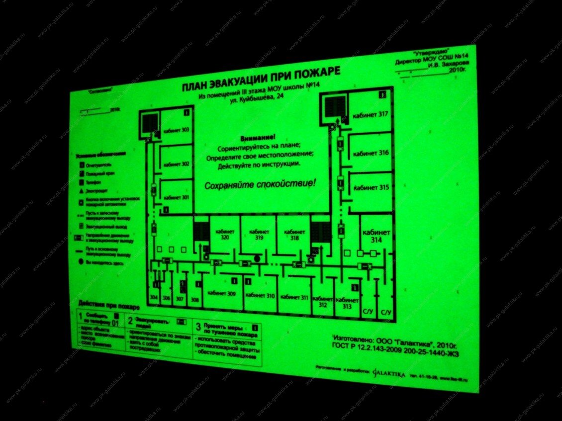 Так выглядит фотолюминесцентный план эвакуацииСпособность материалов-люминофоров – послесвечение дает возможность рассмотреть эвакуационную схему на протяжении длительного времени, не требуя дополнительной подсветки. В современных офисах или на предприятии в темноте людям легко заблудиться в длинных коридорах. План эвакуации при пожаре, способный в темноте светиться, сориентирует человека, который находится в здании, где безопасный выход. Поэтому он сможет быстро продвигаться в правильном направлении. При возникновении экстренной ситуации люди не должны оказаться в ловушке.