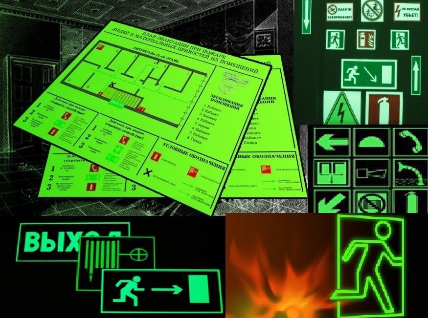 Хорошо видимые в темноте знаки информируют об эвакуационных путях и способах ликвидации пожара. Они используются в различных зданиях общественного назначения. Изготовление планов эвакуации из люминесцентных материалов целесообразно только в том случае, если помещения, в которых они будут располагаться освещены достаточно хорошо.
