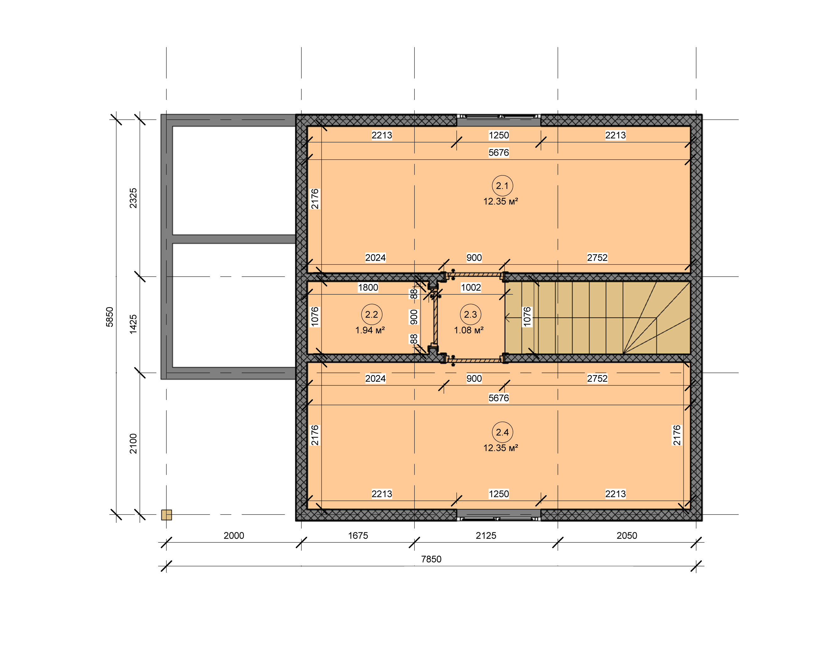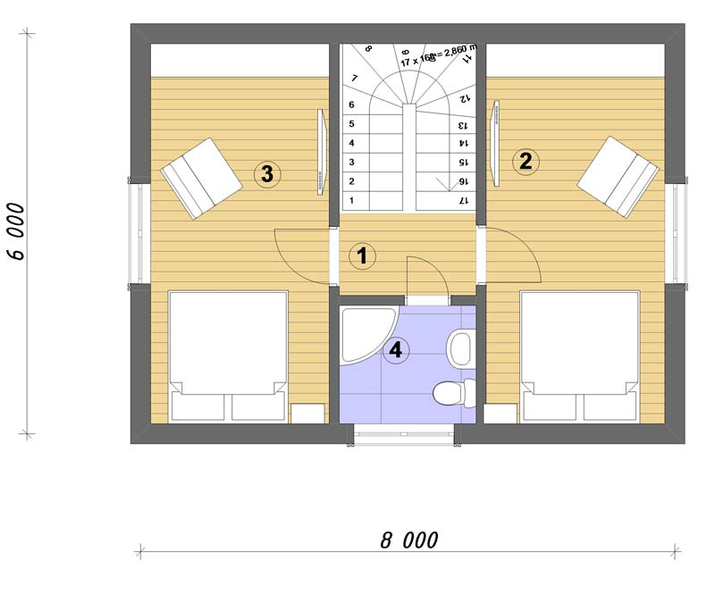 Исходя из предложенного проекта небольшого дома, на втором этаже будет размещена только одна комната, выполняющая функции спальни. Под это помещение достаточно будет выделить 6,96 кв м площади, размером 2,54 м х 2,74 м