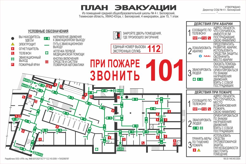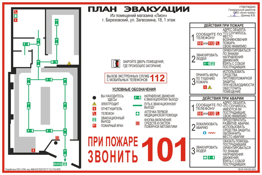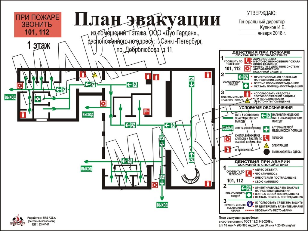 Эвакуационный план должен иметь подписи ответственных лиц, а также тех, кто проводил его прием.