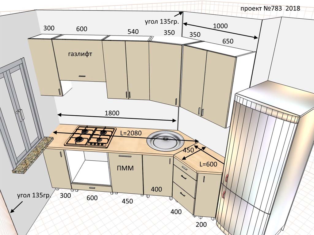 Угловая планировка кухонной мебели L – углом позволяет реализовывать разные по глубине варианты сторон: одна может иметь глубину 350 — 450 мм, а другая – 600 мм, что дает дополнительные несколько сантиметров для удобства перемещения.