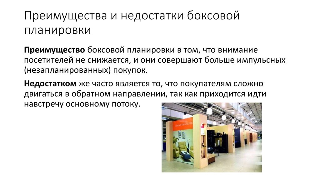 Боксовая планировка – простой вид планировки, при которой торговый зал разделяется на изолированные друг от друга отделы.