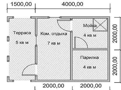 Такой масштаб является маленьким, поэтому при проектировании данных помещений нужно быть аккуратным. Конструкция должна одновременно вмещать в себе парилку, моечную, часто и душевую с раздевалкой. Как правило, в данных случаях большую часть места отделяют для парилки. Нередко в таких банях имеется окно.
