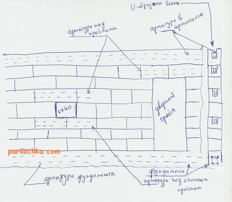 - Сборка стен – процесс, требующий использования армированных поясов и бетонного раствора.
