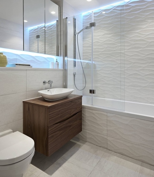За счет вариативности фактуры оттенка они могут создать поверхность с нужной отражательной способностью. - Доминирование белого цвета избавляет ванную от жестких стеновых перекрытий. За счет этого можно визуально сделать стены выше и шире.