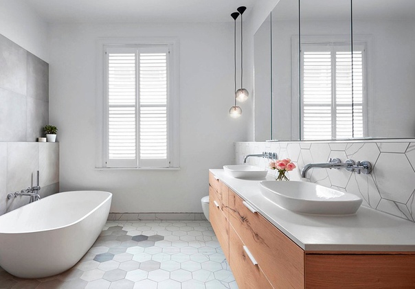 Даже в викторианских помещениях можно использовать деревянную плитку. Нам нравится отдельно стоящая ванна и женственное качество окружающих ее предметов. Но белоснежный пол, который выбрали Sand & Sisal, действительно привлек наше внимание.