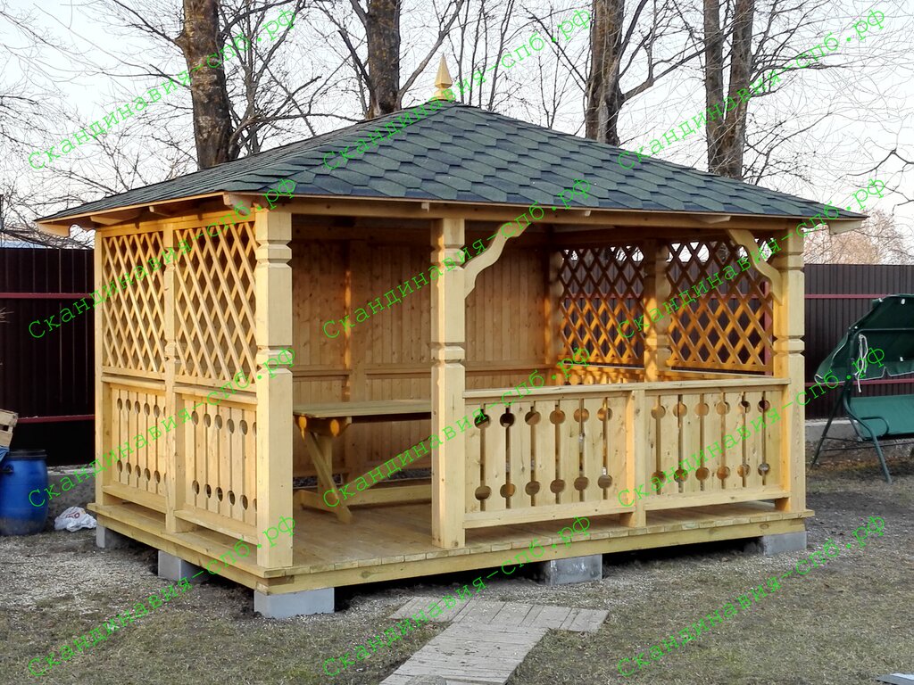 Варианты, рассчитанные на круглогодичное использование, накрытые крышей из рулонной черепицы, с установленным полом из деревянных досок, со сплошными узорчатыми перилами и защитными шторами, просчитываются отдельно.