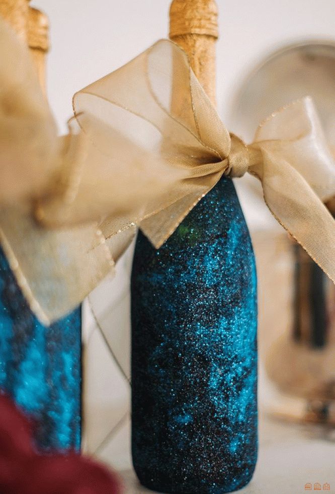 Один из самых эффектных способов того, как украсить бутылку шампанского своими руками, — украшение блёстками, или глиттером. Понадобится клей-спрей и непосредственно блёстки. Рабочую поверхность защитите бумагой, а руки — перчатками. Обрызгайте бутылку клеем и сразу же сыпьте блёстки. Останется дождаться, когда клей полностью высохнет и стряхнуть лишнее.