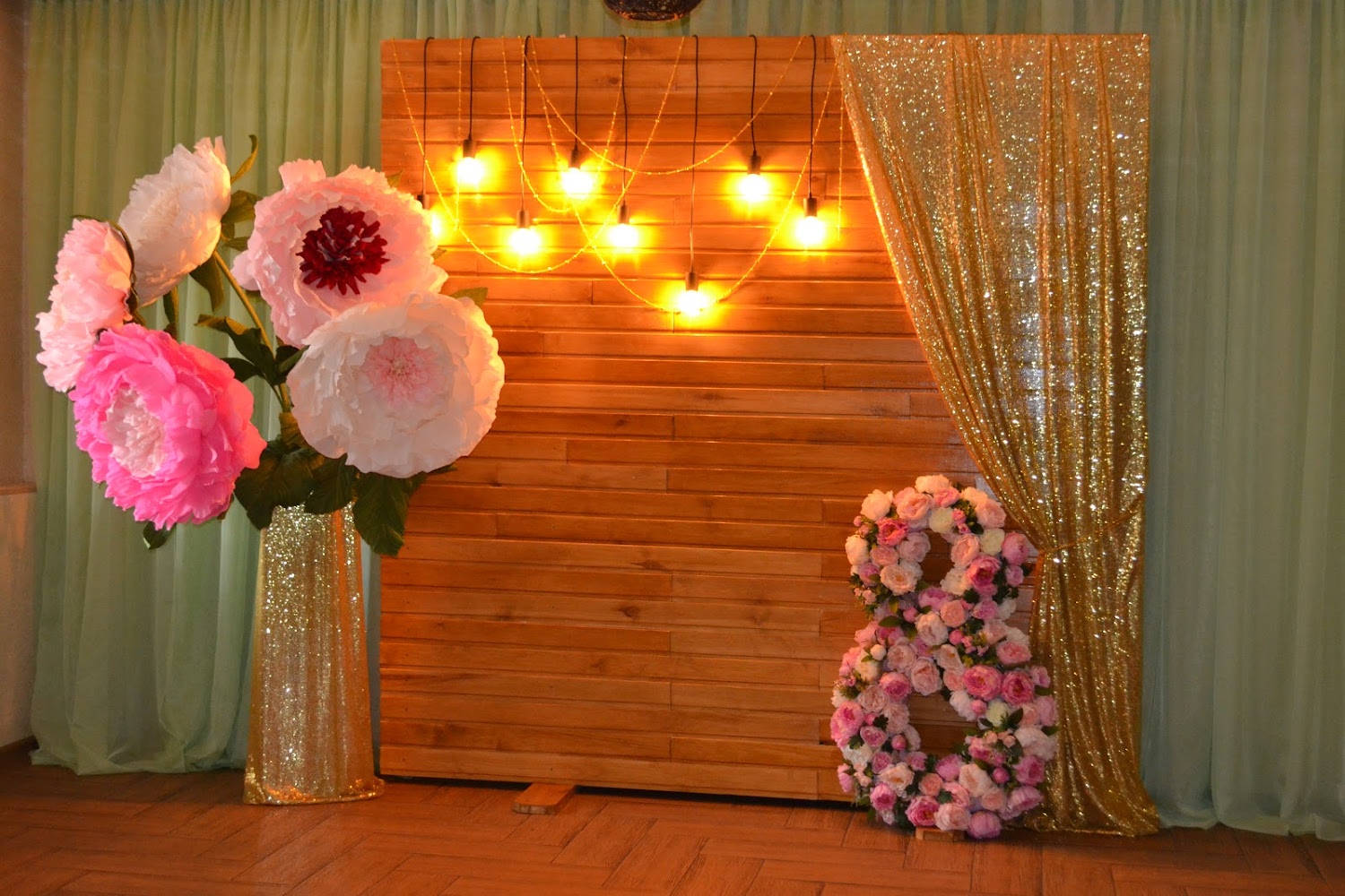 На любом празднике успехом пользуется фотозона, где нарядные гости могут сфотографироваться на память. Такую зону можно заказать у дизайнера, но лучше соорудить ее самостоятельно. Это прекрасный повод проявить творческую фантазию. На детском дне рождения бумажными букетами оформляют candy bar. Это не так привычно, как воздушные шары, поэтому воспринимается всеми участниками вечеринки на ура.