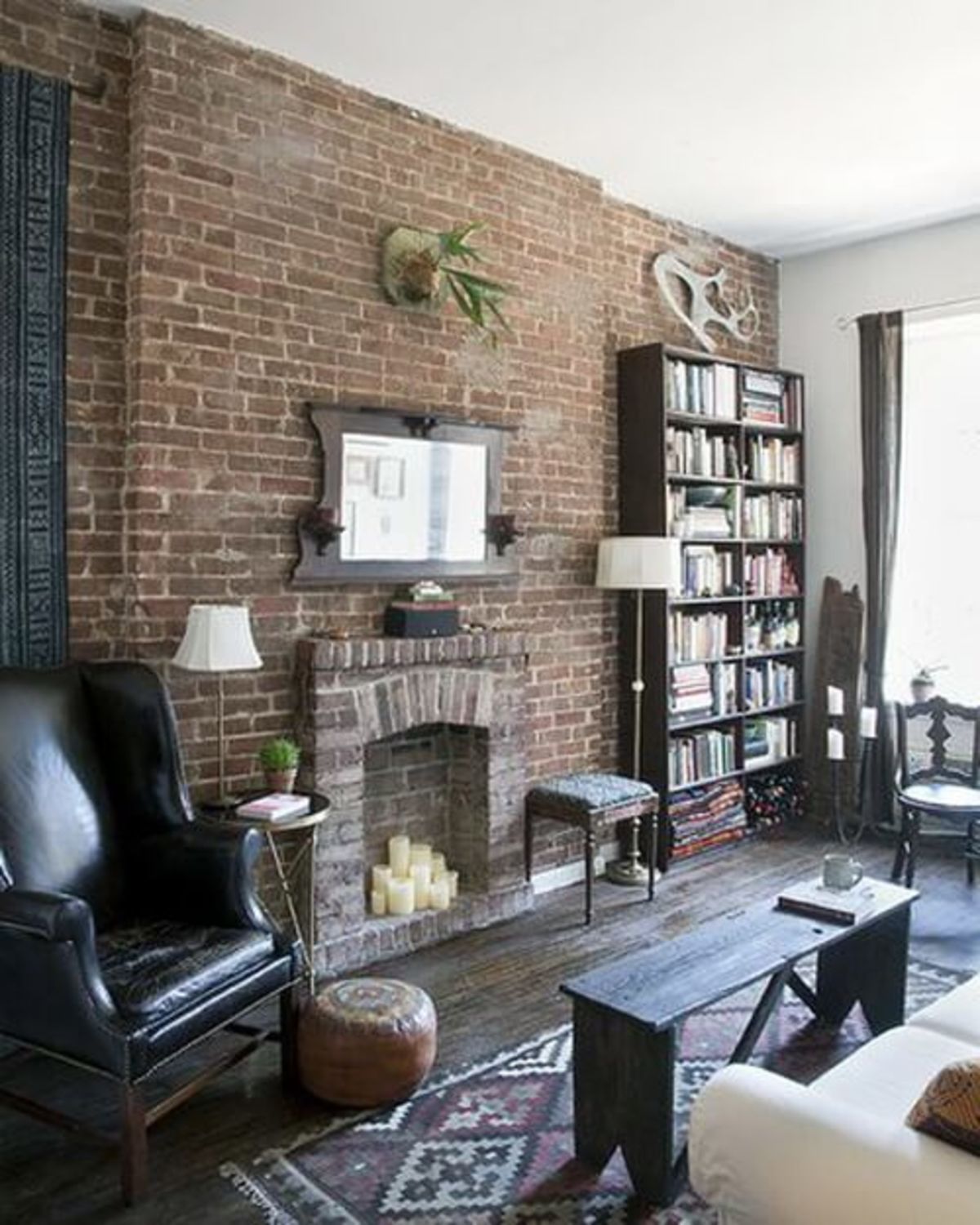 Для кирпичной стены не нужно, чтобы на первый план выходило много деталей, полок, картин, часов. Достаточно одного привлекает внимание.