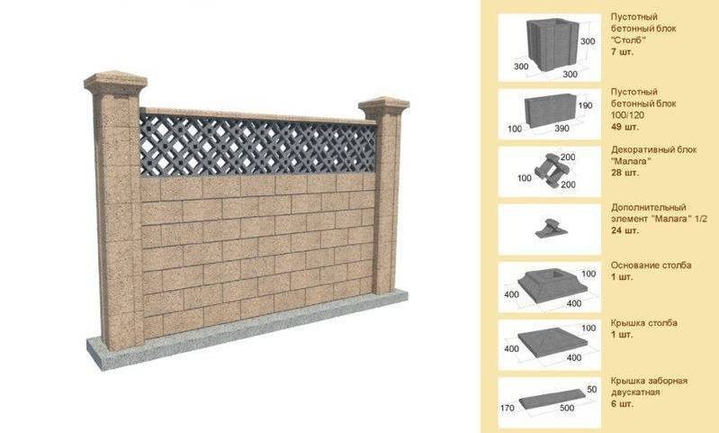 Формы блоков могут быть различны, но обычно это прямоугольник или квадрат. Полнотелые блоки тяжелые и применяются для прочных массивных оград «на века», но у пустотелых бетонных блоков сфера применения шире.