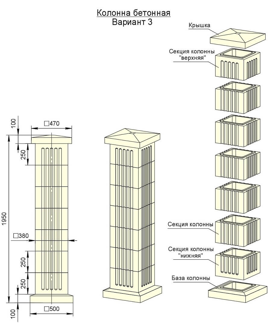 Сборка заключается в укладке бетонных секций вокруг трубостойки или арматурного каркаса, верх столба образует бетонная крышка-оголовок.