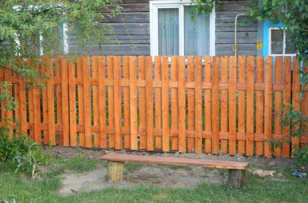 Такое название получили отшлифованные планки одинаковой ширины и высоты. Прибивают их к лагам вертикально либо горизонтально. Верхушка штакетины бывает разной (обычный спил, резьбленная). Зависит от предпочтений владельцев и их бюджета. Такой забор выходит недорого.