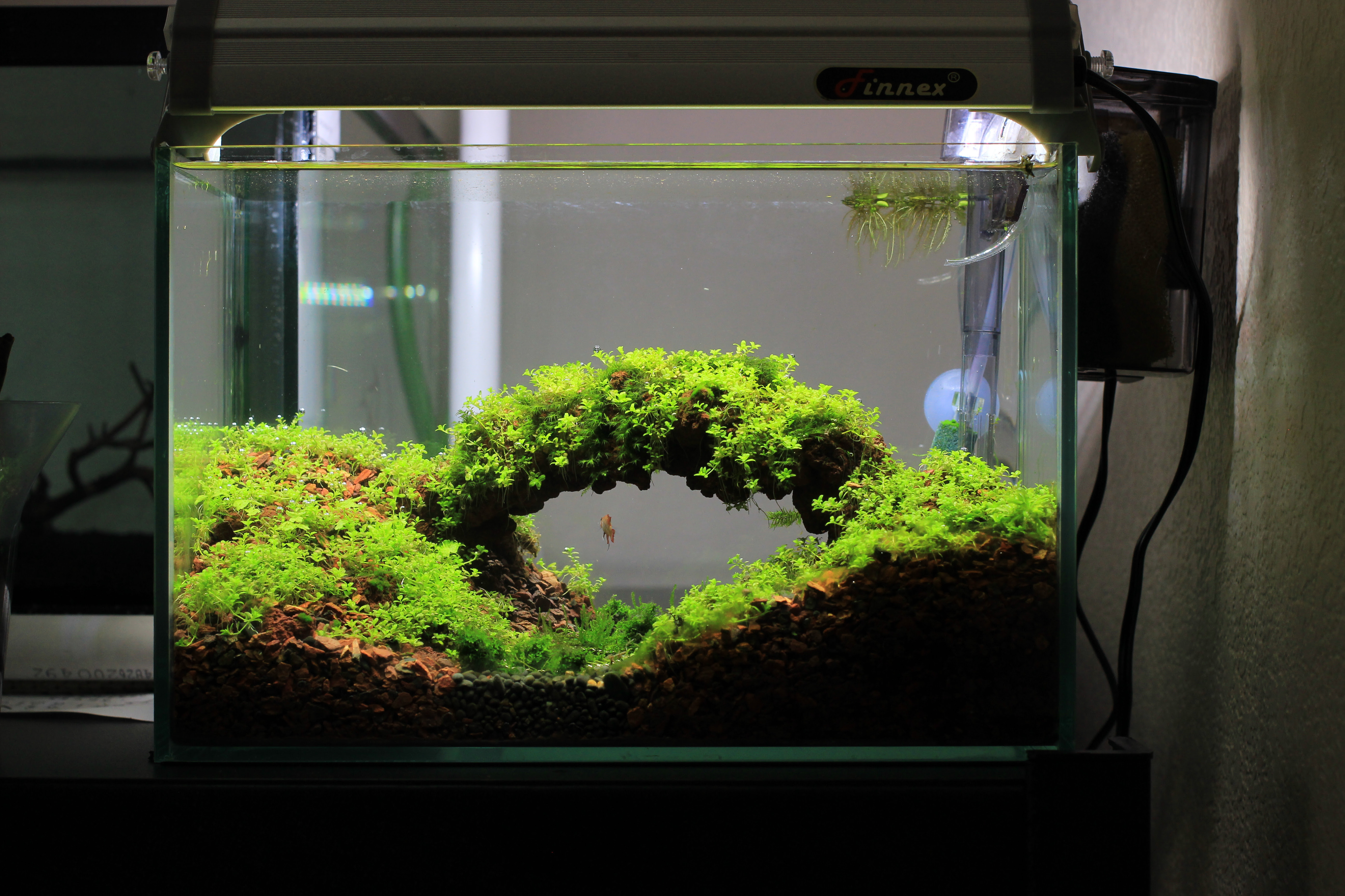 Hemianthus callictroides оказался слишком светолюбивым, чтобы хорошо себя чувствовать в нижней части аквариума при всего 7 Вт светодиодного освещения. Он был удален и заменен небольшими пучками Fontinalis antipyretica которые не так требователен к количеству света.