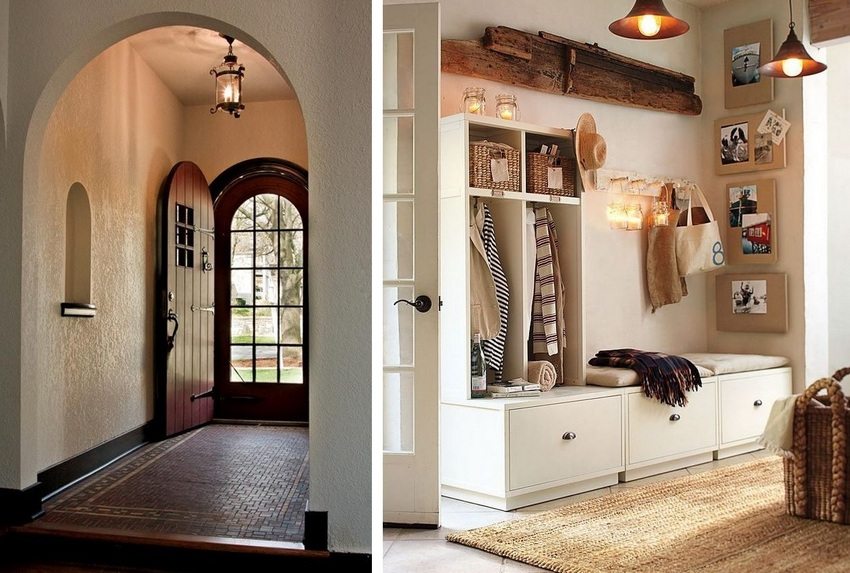 В деревенских или дачных домах часто встречается прихожая в виде тамбура, представляющего собой небольшое, холодное и неотапливаемое помещение. Его обставляют обувной полкой, кованой вешалкой и простой скамейкой. Пол выкладывают с помощью плитки, а поверхность стен оформляют штукатуркой.