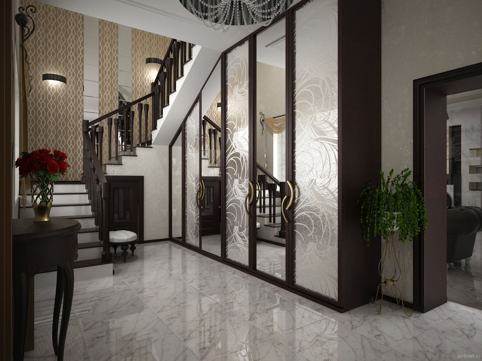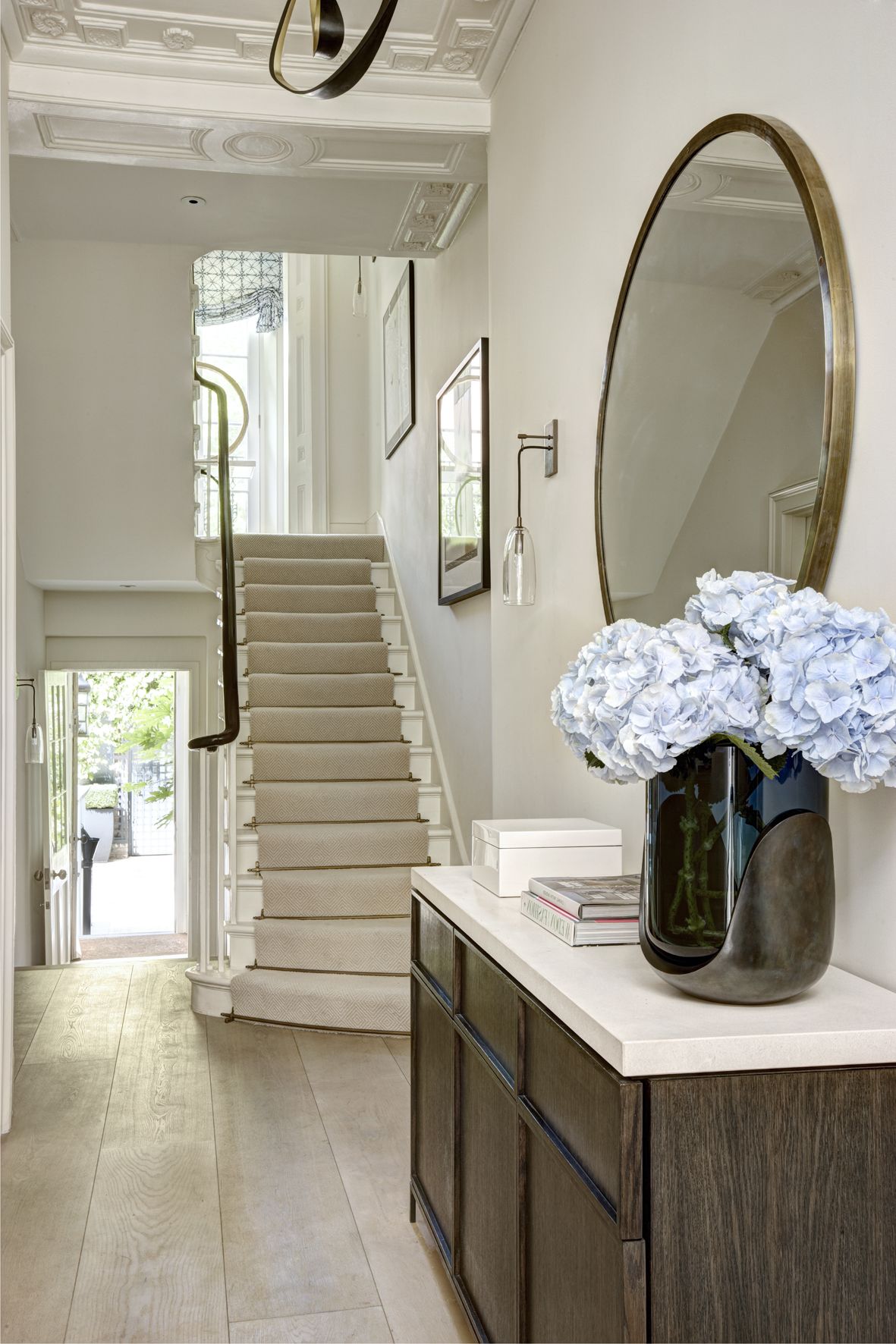 Все эти варианты выглядят интересно, поскольку контраст автоматически подразумевает объем и динамику. Итак, для оформления холла и прихожей в проекте на фото мы выбрали световую гамму с контрастными черными вкраплениями.Мрамор на полу, обои GP & J Baker на стенах.