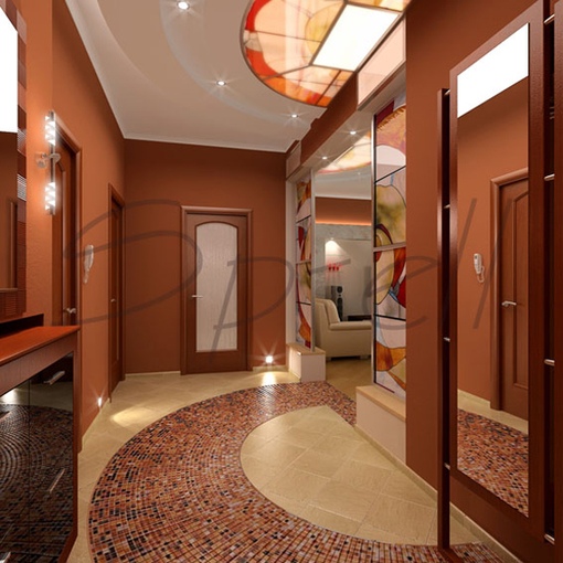 Для просторного коридора могут применяться любые дизайнерские задумки. Интерьер выполняют, как в светлой цветовой палитре так и в темной бордовой, коричневой или темно-синей гамме.