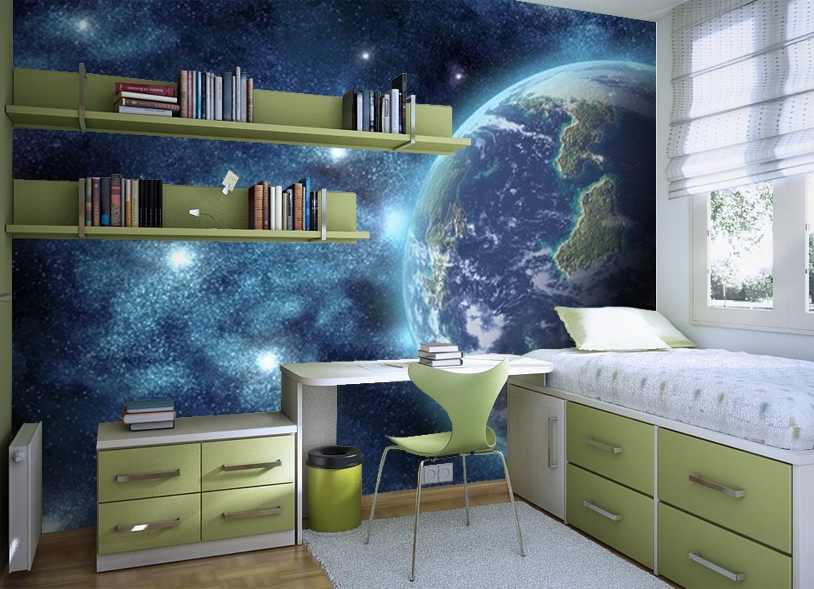 Если вы хотите оформить интерьер «на вырост», то выбирайте из нейтральных оттенков: серого, бежевого, белого, светло-коричневого. Их можно дополнить контрастным черным и яркими акцентами в декоре или мебели. Интересно смотрятся фотообои с чертежами автомобилей или самолетов, космической тематикой, динозаврами и т.д.