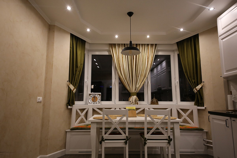 При расстановке мебели в пространстве стол обычно ставится возле ниши. Это красиво и удобно, так как место, где сидят люди, всегда будет хорошо освещено в дневное время. Однако есть одно важное правило: мебель не должна стоять вплотную к карнизу – до кухонного эркера должно быть свободное пространство.