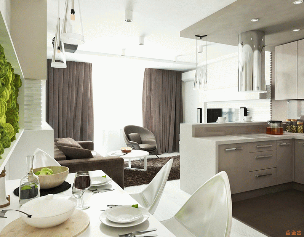 Для экономии площади кухню можно соединить с гостиной