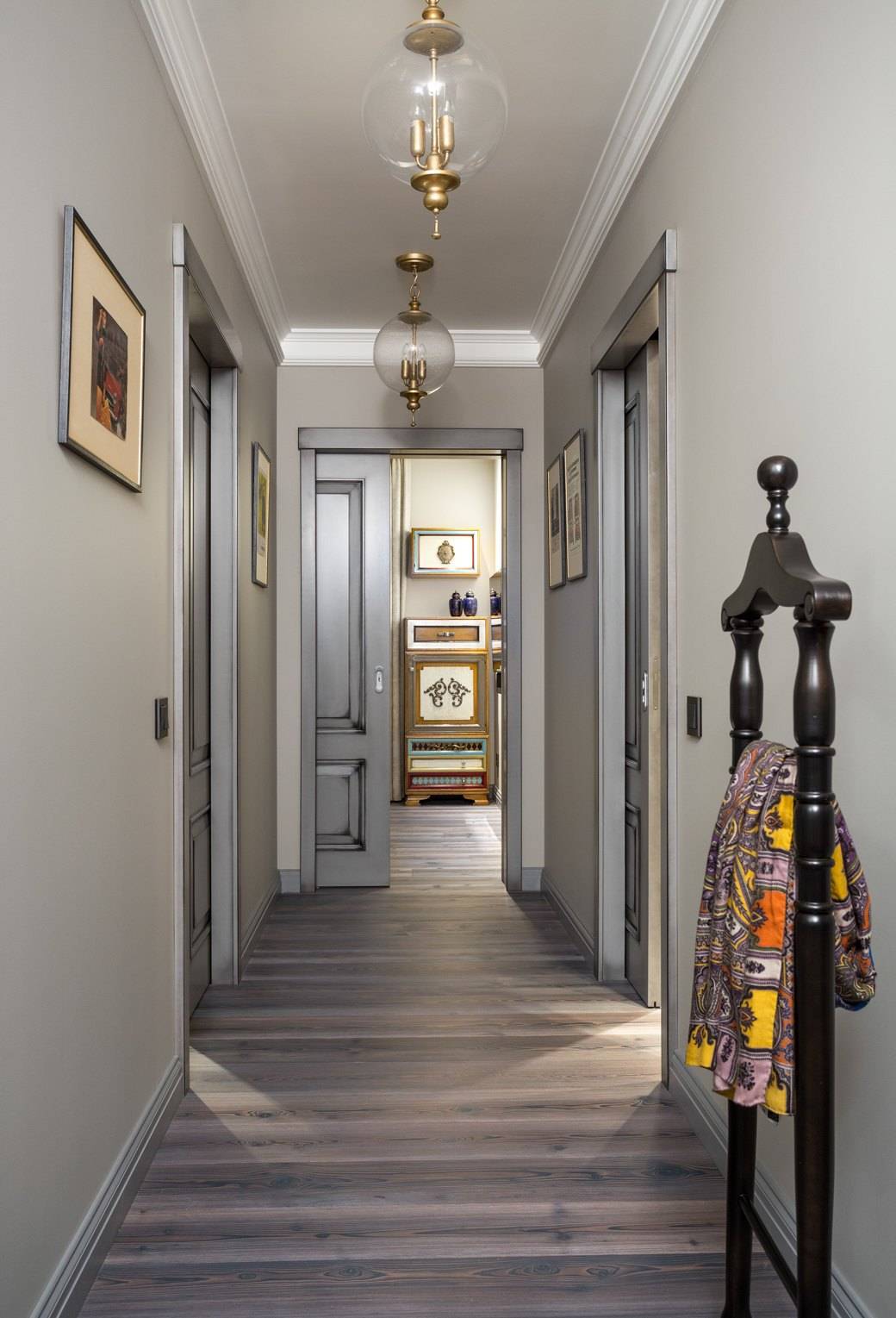 Дополняют зеркала с достаточным освещением для темного утра и вечера. Прихожие в стиле длинных коридоров часто нуждаются в сочетании освещения от ярких потолочных светильников и уютных настольных ламп для создания атмосферы.