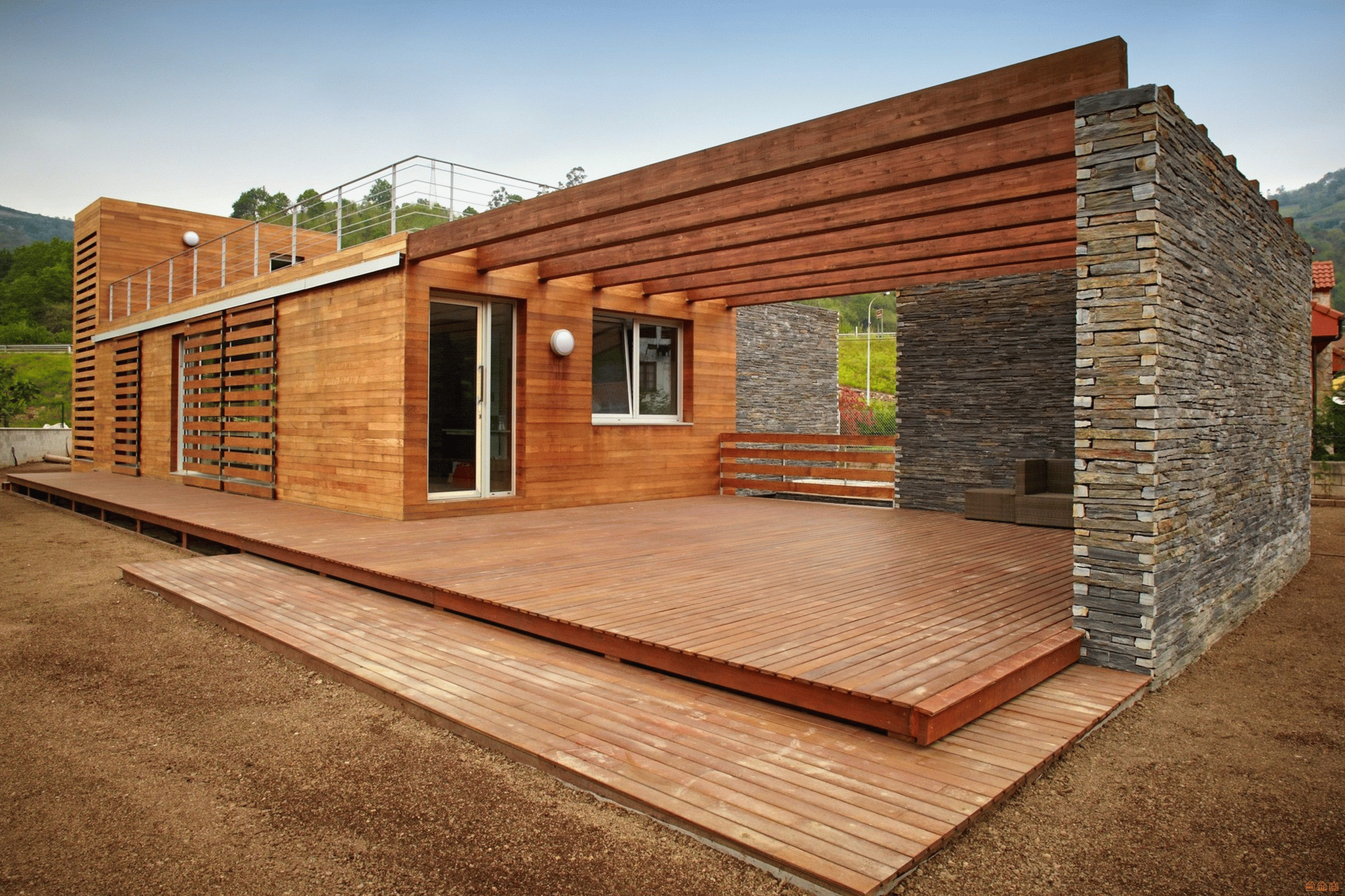 На фото частного двухэтажного дома с террасой — уникальный дуэт золотисто-медового дерева и состаренного металла с искусственным ржавлением. Интересная деталь отделки — наличие каменного цоколя у здания ультрасовременной архитектуры с плоской кровлей.