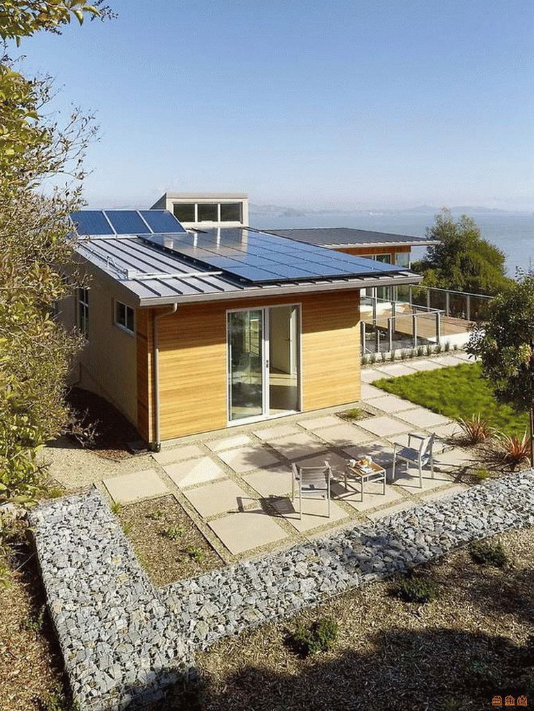В последних двух примерах архитекторы проявили немного творчества в дизайне крыш. В первом случае конструкция крыши использует две односкатные крыши (или разделяет двускатную крышу пополам) и добавляет зеленую крышу.