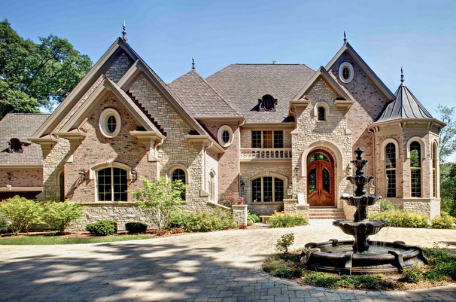 Вот McMansion с большой каменной башней у входной двери.Испанский особняк с башенкой без окон