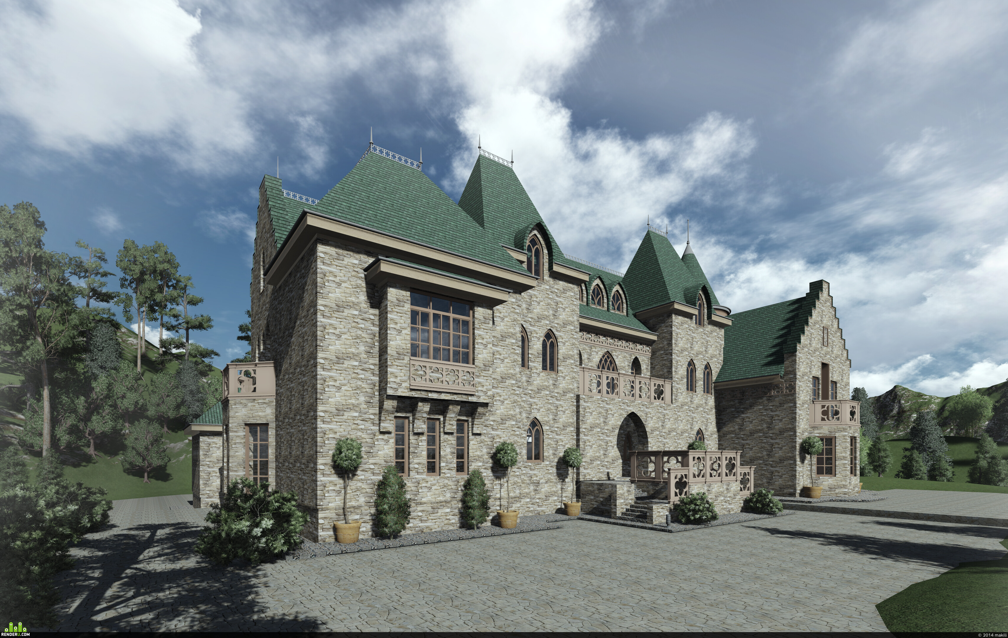 Для постройки коттеджа в замковом стиле предпочтительно использовать натуральные материалы.