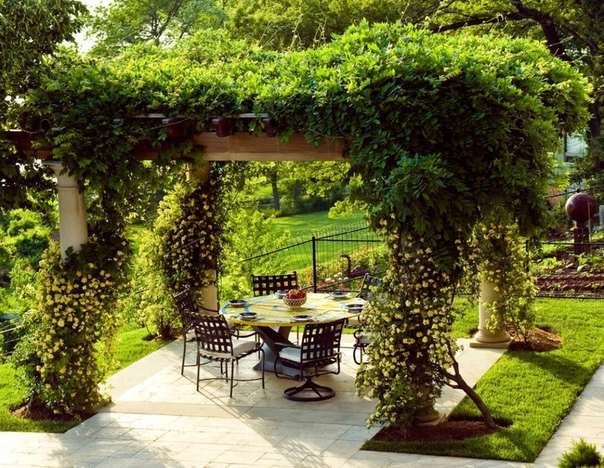 Вертикальное озеленение в эстерьере — то есть вне стен дома, снаружи — может быть реализовано как с помощью специального оборудования для создания вертикальных зеленых объектов, так и без него — с помощью лиан и ампельных растений. Такие виды работ выполняются при благоустройстве приусадебных участков, декорировании пергол и беседок, внешних стен дома или забора.