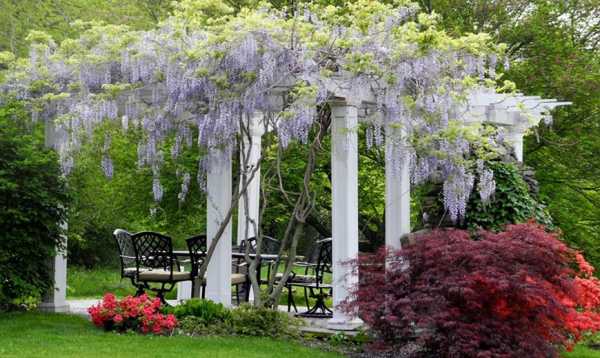 Оформленная красивой растительностью пергола или беседка защитит хозяев от знойной жары и сохранит влажность в воздухе. Также озеленительные вертикальные конструкции помогут защититься от пыли, шума.