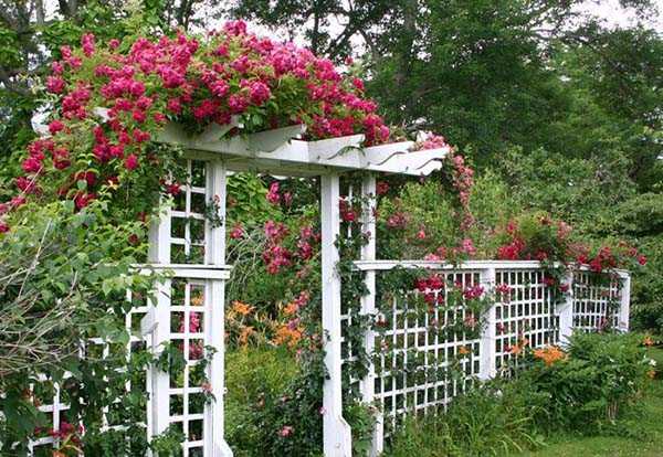 Чтобы помочь растениям подниматься по арке, можно закрыть ее тонкой решеткой или сеткой.
