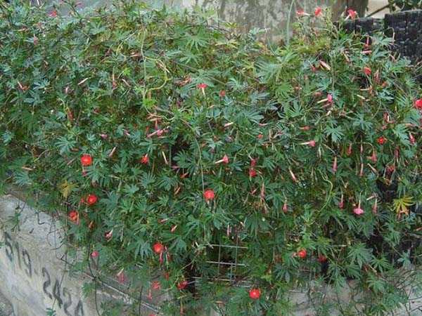 Квамоклит – лианообразный цветок с яркими небольшими соцветиями. Начало цветения – июль. Требует высадки на солнечных участках, регулярный полив. При активном росте желательна подкормка.