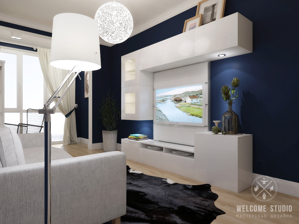 Чтобы не возникло эффекта «чрезмерного отдаления», — обязательно украсьте голубые поверхности (диван — подушками с орнаментом, стены — черно-белыми фотографиями). Дополните интерьер легкими шторами, белыми столиками и плетеными корзинками.