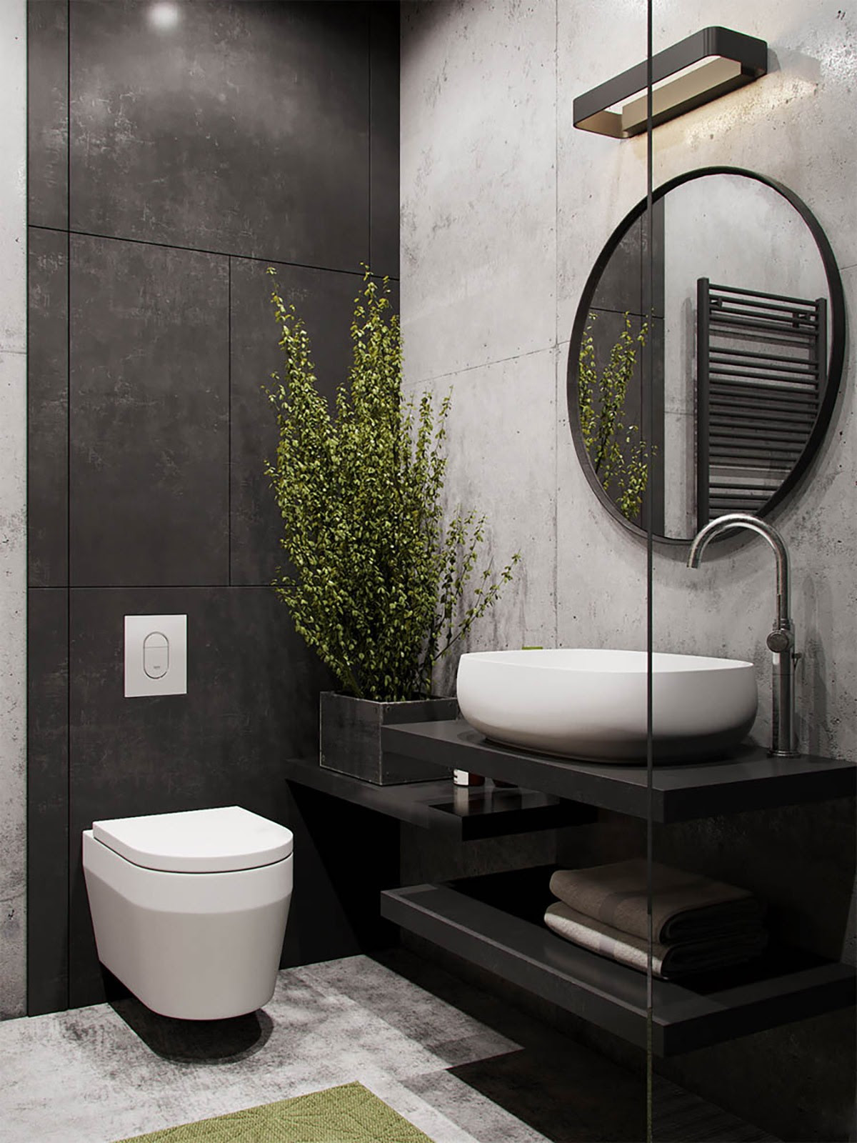 Но тогда стоит уделить отдельное внимание освещению комнаты, т.к. от этого будет во многом зависеть атмосфера помещения. Стоит также задуматься о глянцевых поверхностях, добавления белых узоров и белоснежной сантехники.