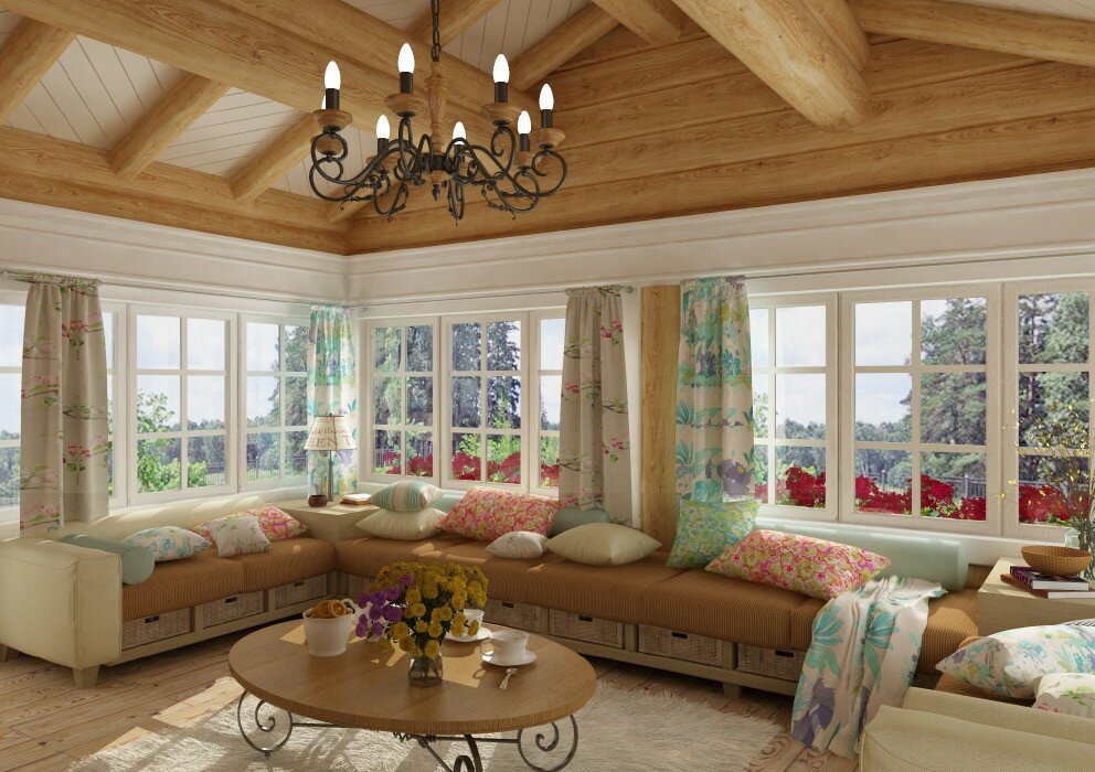 Обязательный элемент интерьера деревянного дома в стиле прованс – текстиль, особенно с узором в виде мелкой растительности. Это тюли, шторы, покрывала, декоративные подушки, мягкая мебель. Текстиль из натуральных тканей будет эффектно сочетаться с окрашенной древесиной. Не забудьте про декор – живые и декоративные цветы в фарфоровых вазах.