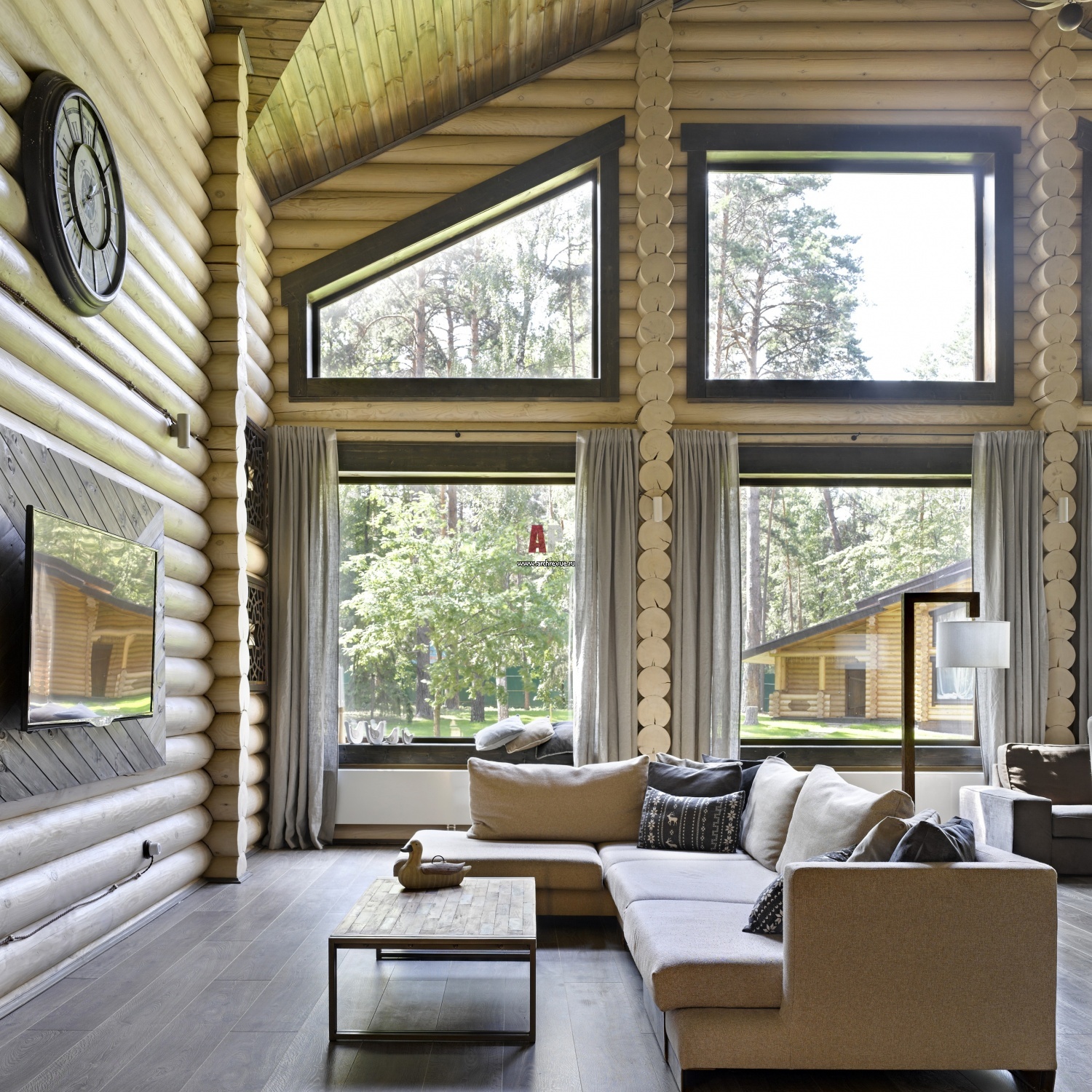 - Интерьер деревянного дома из бревна эффектно дополнит пол из покрытых лаком досок, особенно с выразительной текстурой и сучками.
