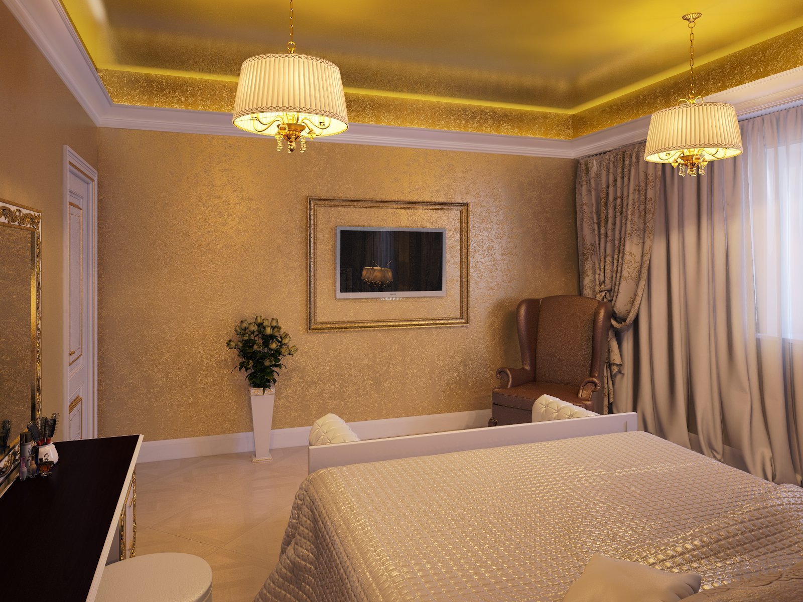 Золото с темным винным оттенком непременно ассоциируется с роскошью и шармом. Такое сочетание будет особенно красиво смотреться на тканевый и виниловых обоях шелкография. Наиболее подходящее помещение для подобного оформления станет спальня или зал.