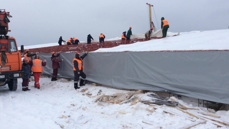 — Первое и, наверное, самое важное – это подготовка опалубки. Опалубка и армокаркас должны быть защищены от снега, для чего сразу после сборки каркас укрывают плёнкой или геотекстилем. Перед бетонированием опалубку осматривают, и если там есть снег, то выдувают его сжатым воздухом либо переносной «ветродуйкой» (ранцевый бензоинструмент для сметания листьев), а если лёд – обливают горячей водой.