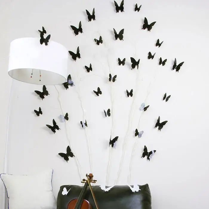 - Оттенок бабочек в интерьере должен контрастировать с цветом стен. Для однотонных поверхностей подойдут цветные фигурки, в светлый монохромный дизайн впишутся черные, для комнаты в ярких красках выбирайте белые.