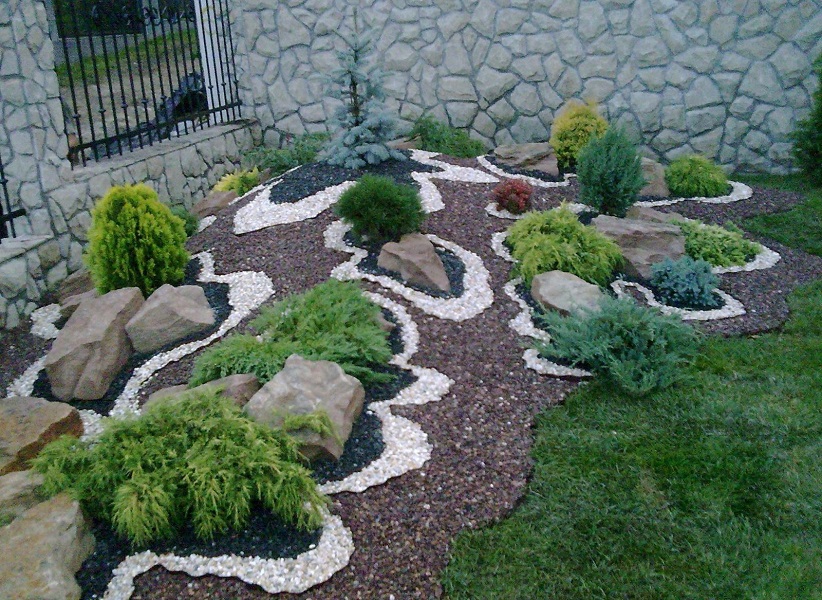 У подножия выкладывают крупные валуны, а сам склон засыпают мелким гравием или щебнем. Обязательный элемент композиции – карликовые сосны либо ели. На склоне можно высадить эдельвейсы, вереск, камнеломки, осоку, другие низкорослые или стелющиеся виды.