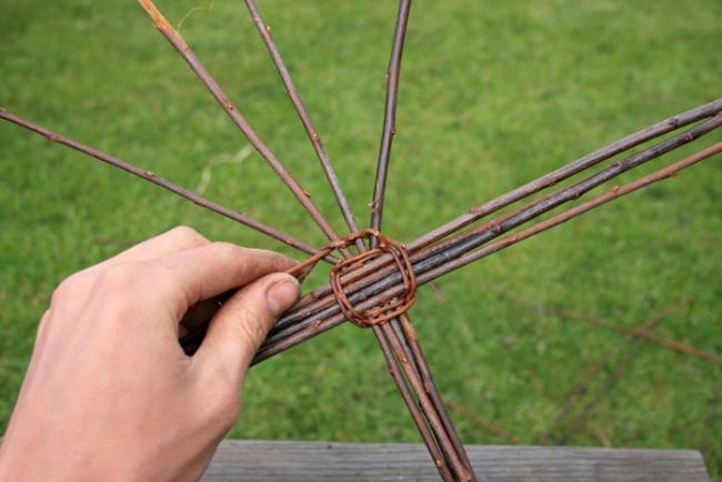 - Плетение начинаем со дна. Берём восемь прутьев. В середине проделываем отверстия и вставляем туда четыре таких же прутика. Получившуюся крестовину оплетаем двумя тонкими прутиками. Делаем несколько витков и разделяем прутья, чтобы каждый стержень имел один лучик. Должно получиться 16 прутиков, устремлённых вверх.