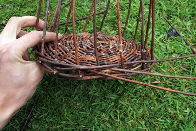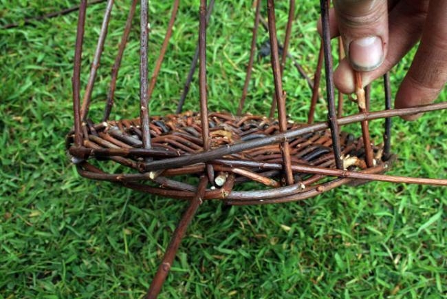 При плетении корзины обязательно добавляйте веточки, пока они не стали слишком тонкими.
