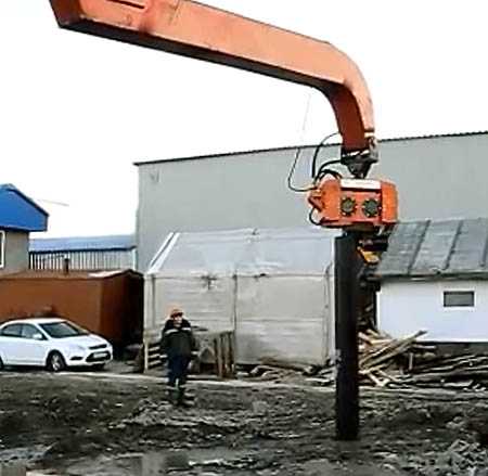 Это тоже насадка на копер, но в основе её работы лежит уже другой принцип. Используется свойство грунта «раздвигаться» под действием вибрации. В вибропогружателе установлены эксцентрические маятники, которые раскачивают сваю до тех пор, пока она не будет погружена, т.е. забита.